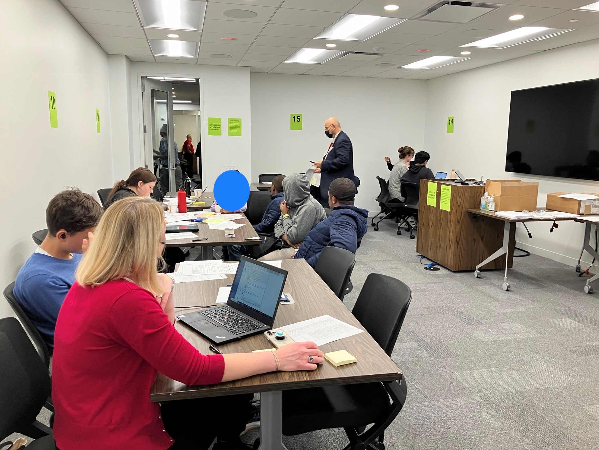 The pilot clinic ran for two weeks. It was whirlwind of activity: we prepared, reviewed, submitted, and processed applications, and completed biometrics, for more than 1,700 individuals living in city shelters. This was a team effort. The city and state provided office space for the clinic and scheduled appointments for individuals from the shelters. While some applicants were not immediately eligible, we were able to advise hundreds of individuals each day. With the aid of interpreters, the preparers and supervisors drafted paper versions of the I-765 application for work authorization. In addition to the documentation, we prepared a fee waiver request primarily based on the individuals temporarily living in shelters. Then our immigration attorney supervisors would conduct a final review of the application packages to ensure all the details were correct and the necessary evidence was included. The USCIS officers on site would then be able to review and process the applications into the government systems.